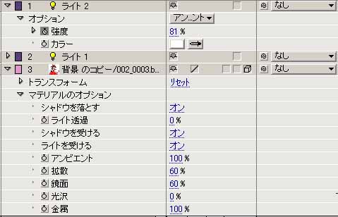 まずは素材の下準備です。 上の位置にあたるレイヤーと、下の影が当たるレイヤーを用意します。 今回は影の当たる部分は新規の白レイヤーです。 両方の素材を3D化した後、白レイヤーにはシャドウを受けるのチェックを、上のレイヤーにはライトを受けるのチェックをつけます。 その後、上の部分のレイヤーの位置を影が映るように手前に寄せます。 レイヤー設定 |